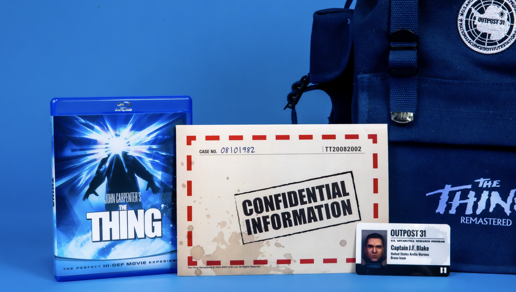 The Thing Remastered kit utilized an embroidered backpack as its primary container, rather than a box. Custom patches and screen-printed emblems were applied to the exterior. The backpack doubled as packaging and a functional item that recipients could reuse after opening. Welcome cards and custom key cards sat at the top of the backpack for immediate visibility when opened. Other items—a water bottle, compass, flashlight, paracord, and copies of the game and film—nested in compartments below.