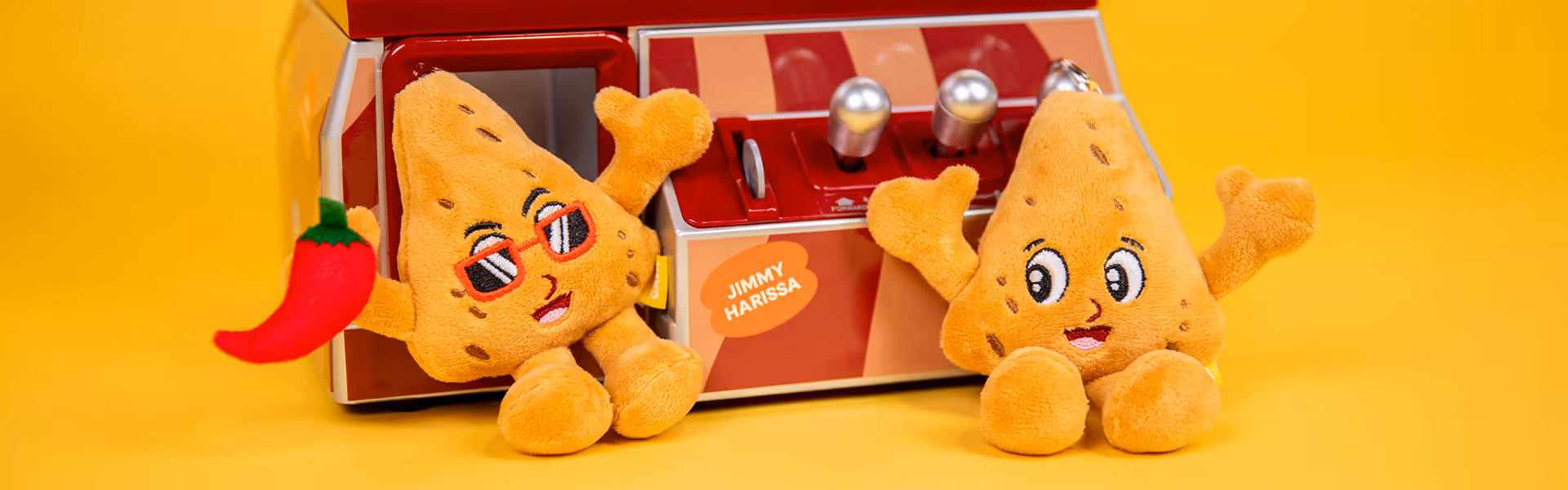 Each kit contained a mini claw machine pre-stuffed with branded CAVA stickers, bright yellow filler and four special edition plushie characters- Peter Chip, Sweet Sammy, Garlic Gus, and Jimmy Harissa.