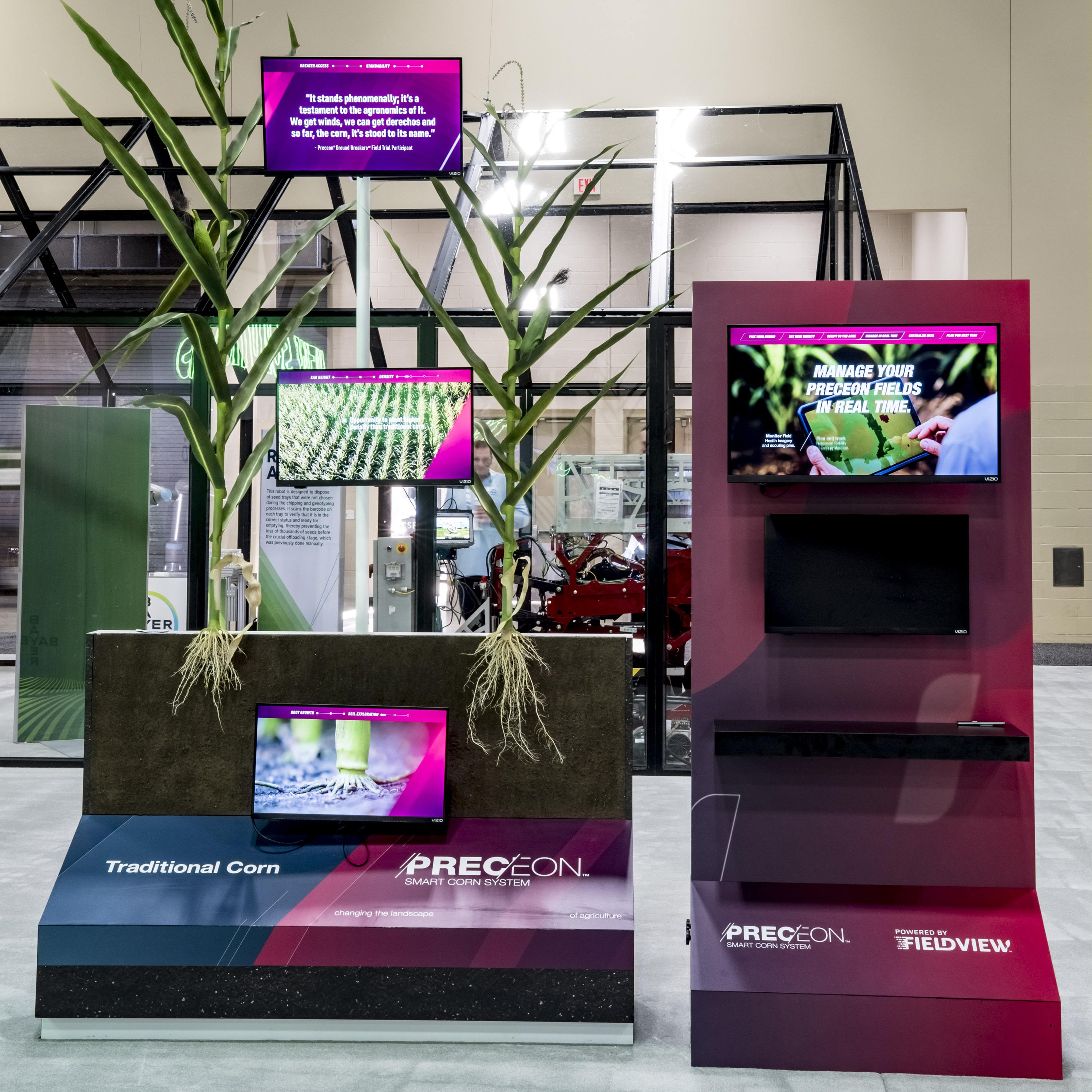 A replica of Bayer's Marana with miniature corn plants and video displays providing a virtual tour. Experience highlighted the state of the art planting technology.